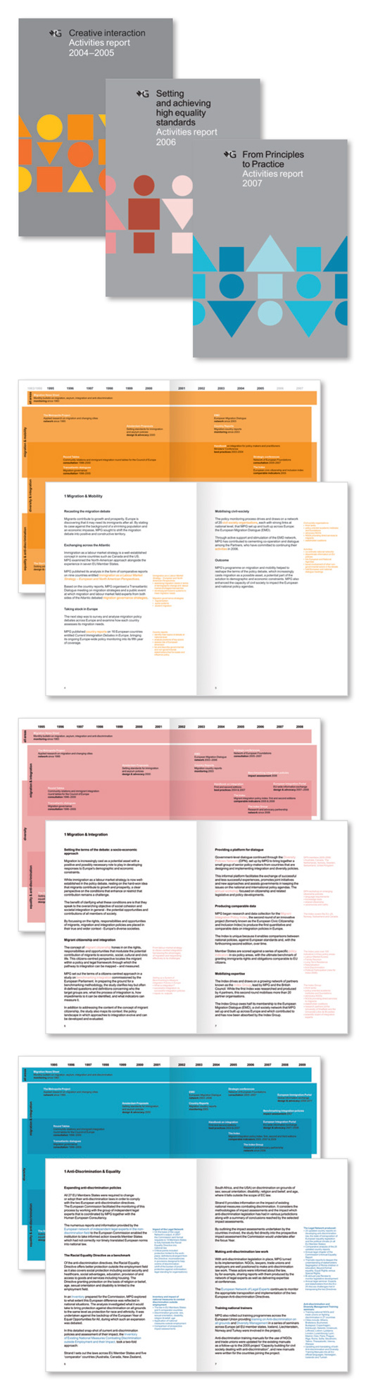 For three consecutive years we have designed their annual reports. To illustrate the three key areas of their work, we established a visual formula grounded on basic shapes (a circle, square and triangle) in which each different arrangement highlights a specific theme: arrows coming and going (migration), male and female figures (equality) and the random composition using the three shapes (diversity).