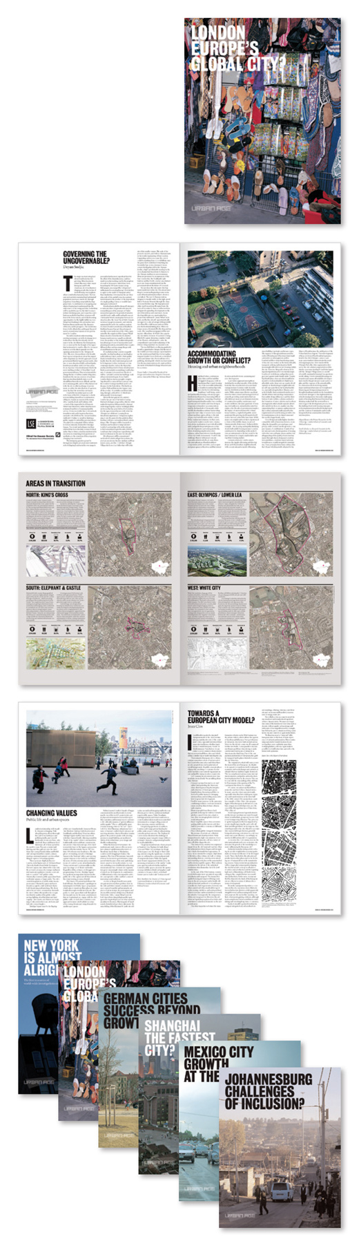 Each conference is marked by the publication of a special newspaper containing critical essays by local experts and international commentators. The grid was designed to be flexible and allow for a quick design (each issue has to be designed in a few days!) Bold typography and the use of specially commissioned photography contribute to an editorial look, which is supplemented by a startling data section full of comparative maps and charts.