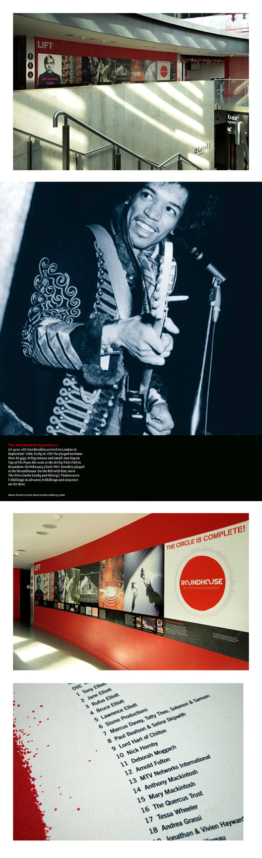 After years of closure due to a lack of funds, it was in 1996 bought by the visionary entrepreneur Torquil Norman, who set up a fund to bring the building back to life, founding a creative centre for young people. We were asked to design an exhibition showcasing the history of the building and we soon saw a use for the long curving wall on its new atrium. The exhibition designed by us unfolded over two floors and focused on some of the key moments that made the Roundhouse the legend it has become. The last panel was designed to show the 360 founding members that sponsored the renovation of the centre by 'buying' one degree of the building circular structure each.