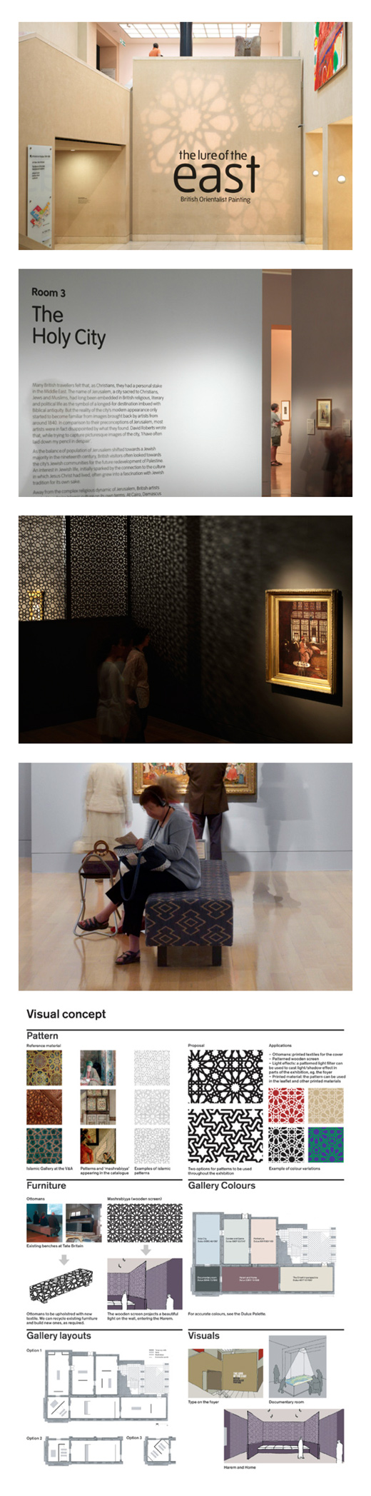 Other features included the design of the furniture, the careful selection of authentic tapestry, a special projection at the exhibition entrance to promote the show, and a most daring 'Harem'-themed room, in which we built a wall inspired by the traditional ‘mashrabiya’ – a type of window screened off with carved wooden latticework – which created a magical atmospheric surprise for the visitors.