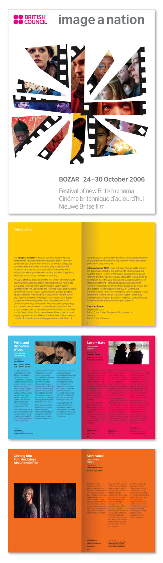 The identity we designed for this edition brings together a series of stills suggesting a British flag made out of film fragments. The programme, designed on A6 format to fit in everyone's pocket, takes advantage of the British Council’s lively colour palette and contains a concise film timetable on the back cover.
