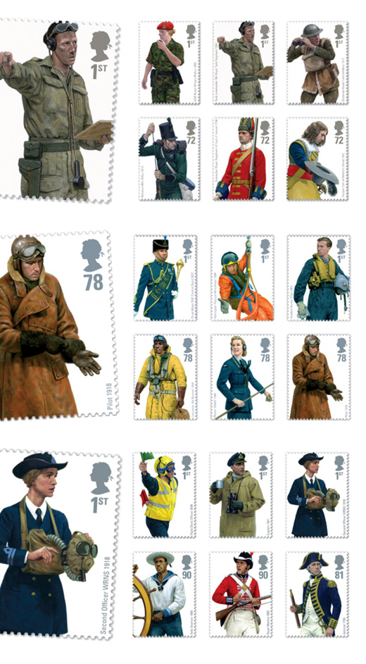 Over a period of three years, we were commissioned by the Royal Mail to design three sets of stamps about the uniforms of the British Armed Forces: those of the British Army, Royal Air Force and Royal Navy.